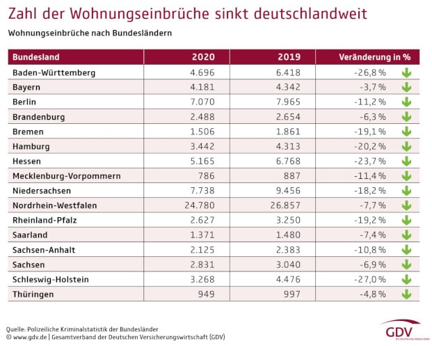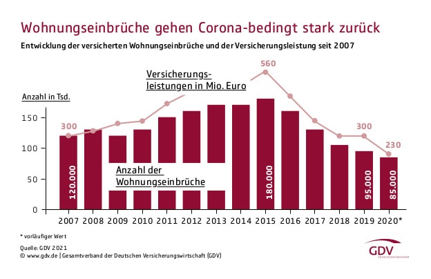 „Der Rückgang der Einbruchzahlen liegt vor allem daran, dass die Menschen wegen der Corona-Pandemie viel Zeit zu Hause verbringen. Einbrechern fehlt somit oft die Gelegenheit für ihre Tat“, sagt GDV-Hauptgeschäftsführer Jörg Asmussen. Mit den sinkenden Einbruchzahlen habe sich die Schadenhöhe um 70 Millionen Euro auf nunmehr 230 Millionen Euro verringert. Der Schadendurchschnitt sei um 300 Euro (minus 9,8 Prozent) auf 2.750 Euro gesunken.