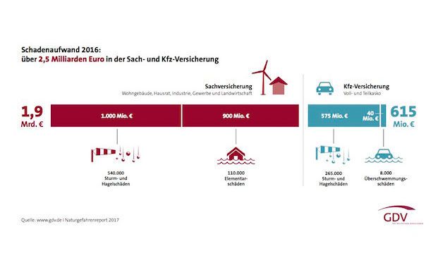 Überschwemmungsschäden kamen auf einen Wert von rund 940 Millionen Euro. 2015 waren es noch 100 Millionen Euro, wie der Naturgefahrenreport 2017 des Gesamtverbands der Deutschen Versicherungswirtschaft zeigt.
