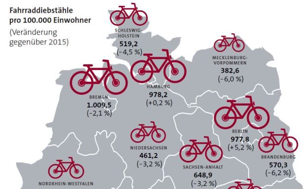 Insgesamt wurden laut Polizeilicher Kriminalstatistik im Jahre 2016 rund 332.000 Fahrräder gestohlen. Etwa 3.000 weniger als im Jahr zuvor.