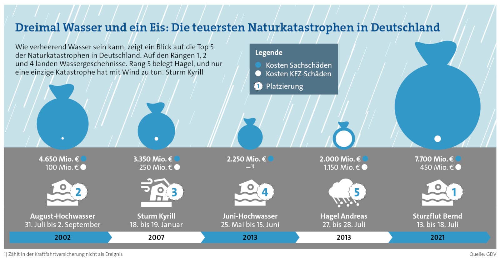 Das bestätigen auch zahlreiche Zahlen vom Versichererverband GDV. Zum Beispiel jene, denen zufolge drei der teuersten Katastrophen in Deutschland in den vergangenen Jahren mit Hochwasser zu tun hatten. Ganz vorn liegt die Sturzflut Bernd im Sommer 2021 mit einem geschätzten Schadenaufwand für Sachversicherungen von 7,7 Milliarden Euro (siehe Grafik). Im Vergleich dazu nehmen sich die Kosten von weniger als einer Milliarde Euro für die Überschwemmung um die vergangenen Weihnachtsfeiertage herum regelrecht bescheiden aus.
