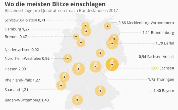 Sachsen hat Hamburg als das Bundesland mit den meisten Blitzeinschlägen abgelöst. Laut dem aktuellen Blitzatlas 2017 von Siemens kam es dort 2017 zu 2,06 Blitzeinschlägen pro Quadratkilometer. Hamburg schaffte mit 1,27 Blitzeinschlägen je Quadratkilometer Rang 7.