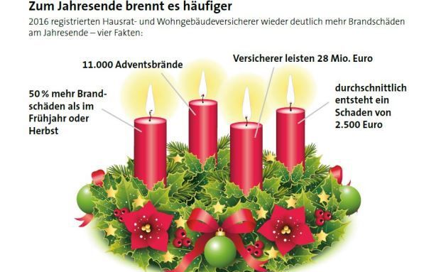 Advent, Advent, ein Lichtlein brennt – doch fängt der ganze Adventskranz Feuer, ist es mit der vorweihnachtlichen Stimmung schnell vorbei. Zum Jahresende 2016 ereigneten sich rund 50 Prozent mehr Brandschäden als im Frühjahr oder Herbst, berichtet der Versicherungsverband GDV. Für die rund 11.000 Brandschäden in dieser Zeit leisteten die Hausrat- und Wohngebäudeversicherer rund 28 Millionen Euro – 2 Millionen Euro mehr als zum Jahresende 2015.