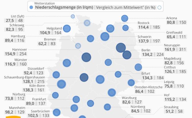 Das Wetter hat in diesem Juli immer wieder für Schlagzeilen gesorgt: Dauerregen und Überschwemmungen sorgten in vielen Teilen Deutschlands für Chaos. Die Niederschlagsmengen lagen dabei hierzulande fast überall über dem vieljährigen Mittel von 1981 bis 2010, wie die Grafik zeigt.