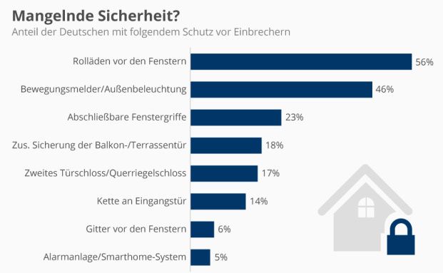 Die Angst geht um, und zwar vor Einbrechern: Viele Deutsche fürchten sich davor. Und zu Recht. Wie der Branchenverband GDV berichtet, ist die Zahl der Einbrüche 2016 im Vergleich zum Vorjahr zwar gesunken. Trotzdem bestehe ein hohes Risiko, Opfer eines Einbruchs zu werden. Wie sich die Bundesbürger vor den Langfingern schützen, zeigt die Grafik.