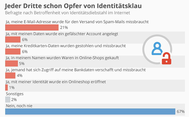 Ein Drittel der Bundesbürger ist schon einmal Opfer von Identitätsdiebstahl im Internet geworden. Das zeigt eine Umfrage der Unternehmensberatung Pricewaterhouse Coopers. Am häufigsten (21 Prozent) nutzen die Cyber-Gangster dabei gestohlene E-Mail-Adressen, um Spam-Mails zu verschicken.