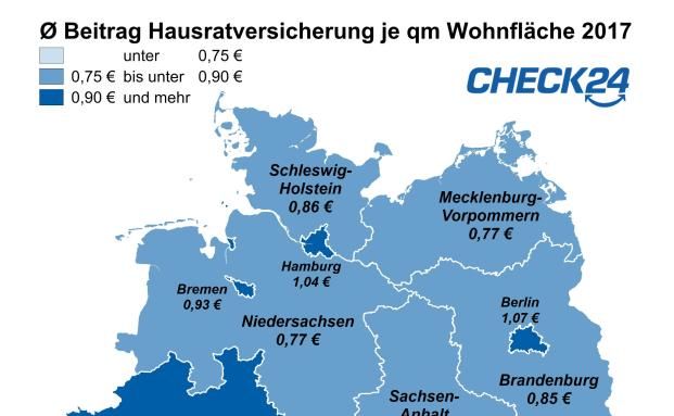 Im Durchschnitt zahlten Check24-Kunden für die Absicherung ihres Hausstandes im vergangenen Jahr 0,87 Euro je Quadratmeter Wohnfläche. Die Beiträge im Norden Deutschlands sind dabei bis auf wenige Ausnahmen höher als im Süden. Unter dem Bundesdurchschnitt liegen die Beiträge in Bayern, Rheinland-Pfalz, Baden-Württemberg, dem Saarland und in Thüringen mit 0,73 Euro pro Quadratmeter im Jahr.