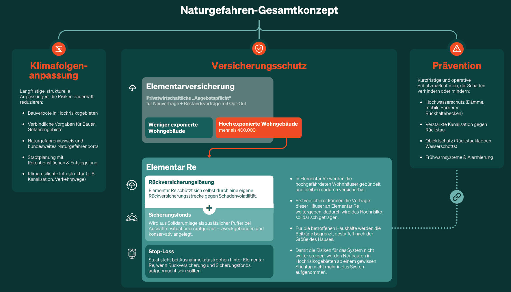 Das wirft aber die Frage auf, wie Häuser in Überschwemmungsgebieten überhaupt zu versichern sein sollen. Und wie lassen sich Risiken aus extremen Naturkatastrophen mit dem Staat teilen. Genau dort setzt Elementar Re als neu geplanter Rückversicherer an.