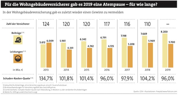 Dies gelte insbesondere im Hinblick auf die Risiken durch den Klimawandel. Insofern wertet Schmidt das Jahr 2019 rückblickend als „ein Jahr des Luftholens“, da bis auf die Frühjahrsstürme vergleichsweise wenig passiert sei. Das nahm auch der Versicherungsverband GDV in seiner kürzlich vorgelegten Hochrechnung erleichtert zur Kenntnis. Demnach hat sich die Ergebnissituation in der Wohngebäudeversicherung 2019 leicht verbessert. „Die von 104,2 auf 96 Prozent gefallene Combined Ratio zeigt einen kleinen Gewinn an“, sagt Marktanalyst Wittkamp.