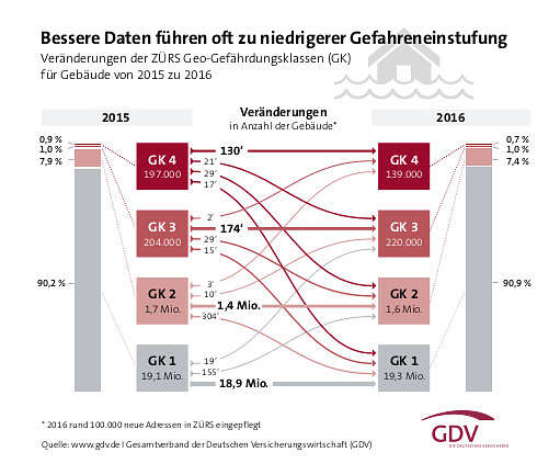 2016 waren laut GDV 139.000 Häuser in die höchste Zürs-Gefahrenklasse 4 eingeordnet. Im Vorjahr waren es noch 197.000 von bundesweit mehr als 21 Millionen Adressen. Damit liegen 0,7 Prozent aller Gebäude in der Zone 4, in der statistisch mindestens ein Hochwasser in zehn Jahren zu erwarten ist.