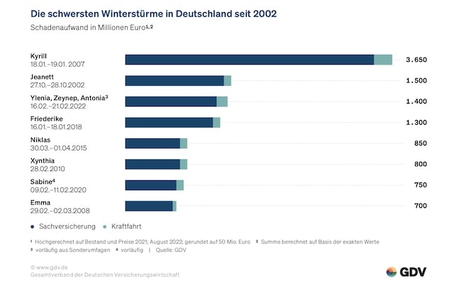 Naturgefahren haben im ersten Halbjahr 2022 Schäden in Höhe von rund 3 Milliarden Euro verursacht. „Bisher ist 2022 ein überdurchschnittliches Schadenjahr. Allein die Wintersturm-Serie Ylenia, Zeynep und Antonia im Februar sorgte mit 1,4 Milliarden Euro für fast 50 Prozent der Schäden“, sagt Jörg Asmussen, Hauptgeschäftsführer des Verbands GDV. Die Sturmserie liegt damit auf Platz drei der schwersten Winterstürme seit 2002.