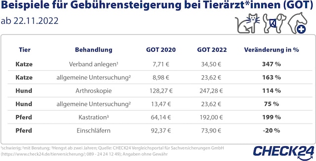 Ab dem 22. November gilt sie: die angepasste Gebührenordnung für Tierärzte (GOT). Es ist die erste Neugestaltung seit rund 20 Jahren. Auf Haustierbesitzer kommen somit teils deutlich höhere Preise zu. Wie hoch, das zeigt eine Übersicht des Vergleichsportals Check24 auf Basis einer Studie im Auftrag des Bundesministeriums für Ernährung und Landwirtschaft.
