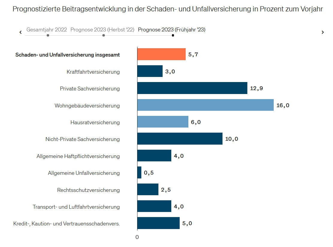 Beiträge in der Schaden- und Unfallversicherung 2023 in Prozent gegenüber dem Vorjahr (Stand: April 2023, Quelle: GDV)
