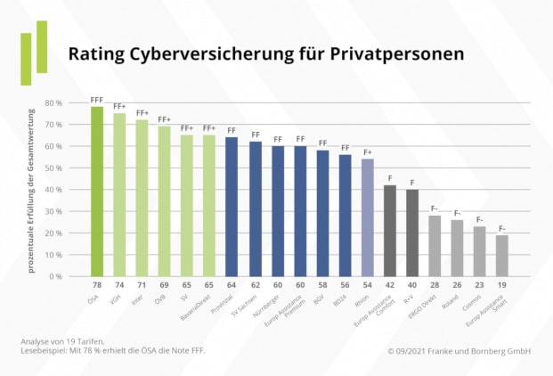 Die beste Notenstufe erreichte keiner der Kandidaten. Testsieger wurde die Öffentliche Feuerversicherung Sachsen-Anhalt („Cyberschutz“ / „Cyber-Rechtsschutz“) mit einer „FFF“-Bewertung (sehr gut). In der Ratingstufe „FF+“ (gut) finden sich dahinter folgende Anbieter wieder: