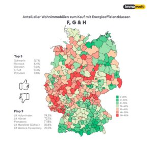 Denn die schlechte Energiebilanz vieler Wohnimmobilien stellt laut Immowelt eine erhebliche Gefahr für die deutschen Klimaziele dar. So macht der Gebäudesektor laut Umweltbundesamt etwa 30 Prozent der CO₂-Emissionen in Deutschland aus. „Die für 2045 angepeilte Klimaneutralität erscheint angesichts des dürftigen energetischen Zustands vieler Immobilien jedoch illusorisch“, heißt es auf dem Portal.