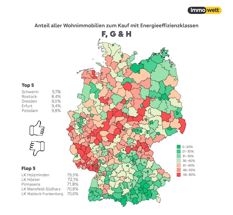 Deutsche Wohnimmobilien sind energetisch nicht auf dem neuesten Stand. Das zeigt eine aktuelle Analyse der Immobilienportals „Immowelt.de“. Danach ist der Anteil der zum Kauf angebotenen Wohnimmobilien mit schlechter Energieeffizienz von 28 Prozent im Jahr 2020 auf knapp 37 Prozent im vergangenen Jahr gestiegen. Die Häuser und Wohnungen hatten die Energieeffizienzklassen F, G oder H.