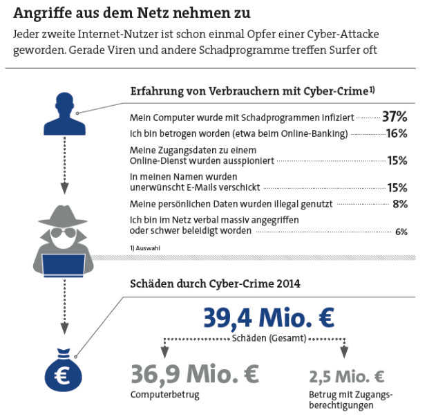 Jeden Zweiten hat es schon mal erwischt. Datenklau, Rufschädigung, Phishing, Cybermobbing – 51 Prozent der Internet-Nutzer in Deutschland sind 2015 schon mal Opfer von Cyber-Kriminalität geworden. Das zeigt eine Umfrage des Digitalverbands Bitkom unter 1.009 Internet-Nutzern. 37 Prozent berichteten dabei von einer Infektion ihres Computers mit Schadprogrammen, 16 Prozent sind beim Online-Banking oder Online-Handel betrogen worden, bei 15 Prozent haben Gangster Zugangsdaten zu sozialen Netzwerken, Online-Shops & Co. ausspioniert.