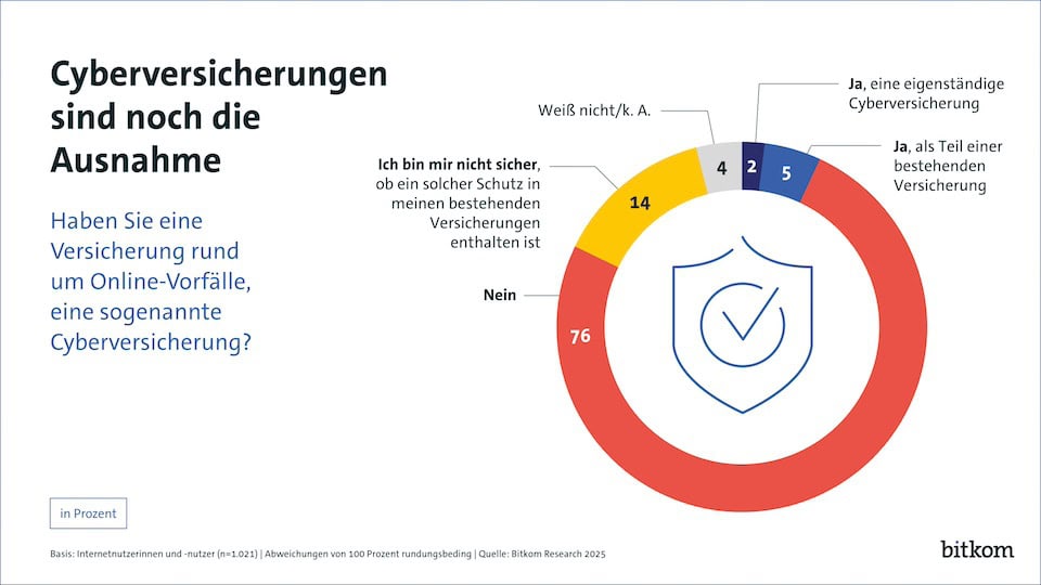 Nur 2 Prozent der Bundesbürger haben eine eigenständige Cyberversicherung abgeschlossen. Bei 5 Prozent besteht ein vergleichbarer Versicherungsschutz, etwa durch eine Rechtsschutz- oder Haftpflichtversicherung. Das sind Ergebnisse einer Befragung im Auftrag des Digitalverbands Bitkom. 1.021 Deutsche ab 16 Jahren, die das Internet nutzen, nahmen daran teil.