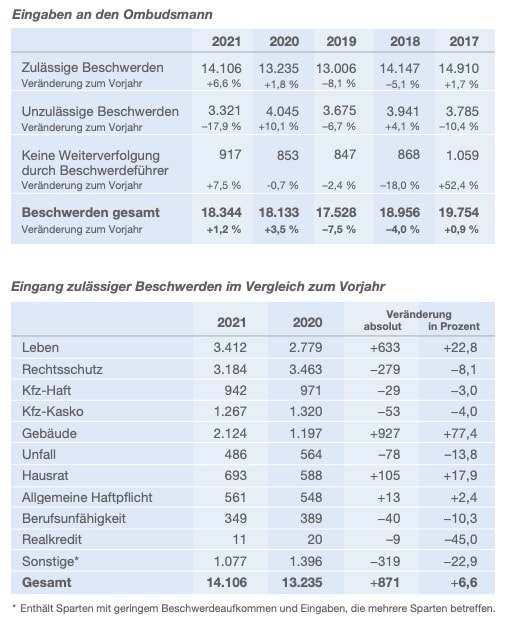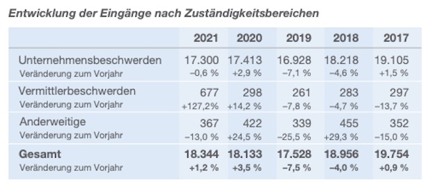 Im Jahr 2021 erreichten die Schlichtungsstelle der Versicherungswirtschaft insgesamt 18.344 Beschwerden, wovon 14.106 zulässig gewesen seien, wie der Versicherungsombudsmann Wilhelm Schluckebier am Dienstag auf Basis seines Tätigkeitsberichts 2021 erklärte (Download des Berichts hier). Gegenüber 2020 bedeute das einen Anstieg der zulässigen Beschwerden von 6,6 Prozent (siehe erste Grafik).