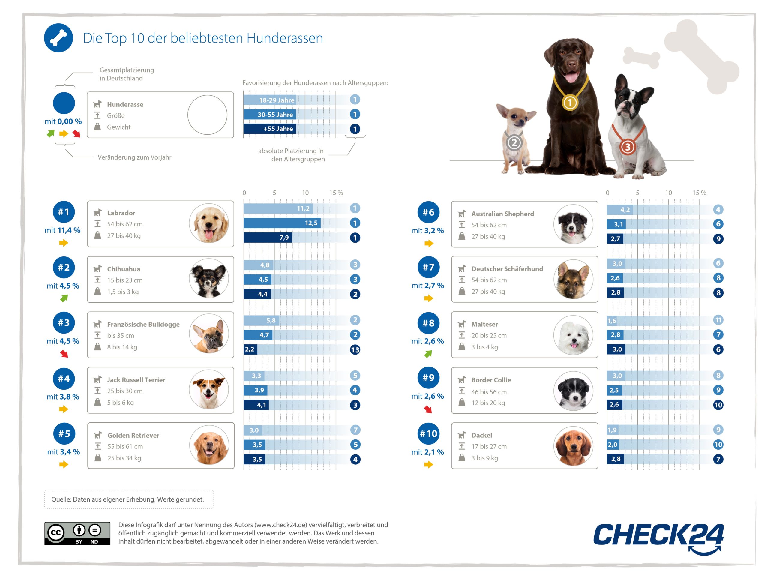„Der Labrador hat es im Beliebtheitsranking bei unseren Kundinnen und Kunden erneut auf den ersten Platz geschafft“, sagt Nina Senghaas, Geschäftsführerin Tierhaftpflichtversicherungen bei Check24. „Das verwundert auch kaum, denn ein Labrador ist der ideale Familienhund.“