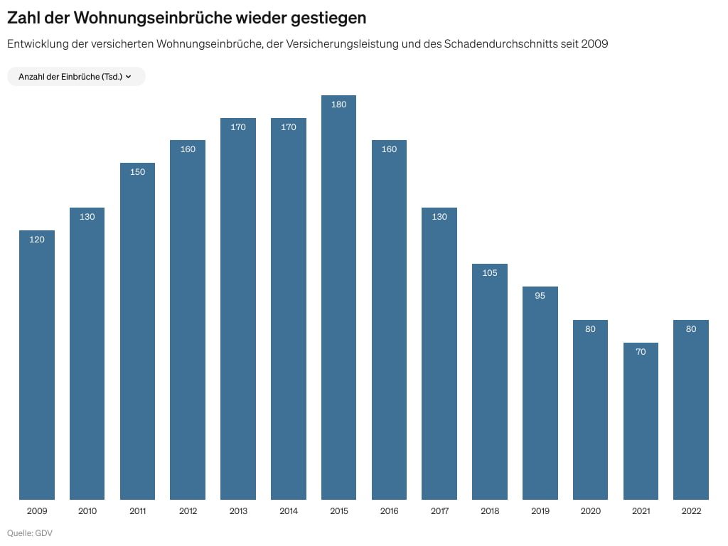 Der zwischenzeitliche Abwärtstrend bei den Wohnungseinbrüchen in Deutschland hat sich nicht fortgesetzt. Wie der Gesamtverband der Deutschen Versicherungswirtschaft (GDV) am Dienstag mitteilte, ist die Zahl der versicherten Wohnungseinbrüche nach den Corona-Jahren wieder gestiegen. Demnach zählten die deutschen Versicherer rund 80.000 Wohnungseinbrüche. 2021 waren es rund 70.000.