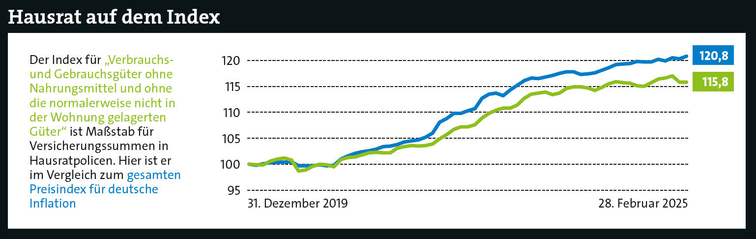 Doch was ist mit den steigenden Preisen? Dafür haben inzwischen die meisten Policen eine sogenannte Anpassungsklausel eingebaut (in den Bedingungen nachsehen lohnt sich). Nach der erhöht sie automatisch jedes Jahr die Versicherungssumme um einen Wert, den der Preisindex für „Verbrauchs- und Gebrauchsgüter ohne Nahrungsmittel und ohne die normalerweise nicht in der Wohnung gelagerten Güter“ des Statistischen Bundesamts anzeigt. Den kann man sich wie den normalen Warenkorb vorstellen, über den das Amt fortlaufend die Inflation in Deutschland misst. Nur, dass es hier um Einrichtung geht, weshalb der Index auch den Spitznamen Hausrat-Index trägt. „Diese bedingungsgemäße Regelung hat den Vorteil, dass der Versicherungsnehmer – aufgrund von allgemeinen Preissteigerungen – nicht automatisch in eine Unterversicherung gerät“, sagt Melanie Woyack aus der Fachabteilung Hausrat bei der Haftpflichtkasse.